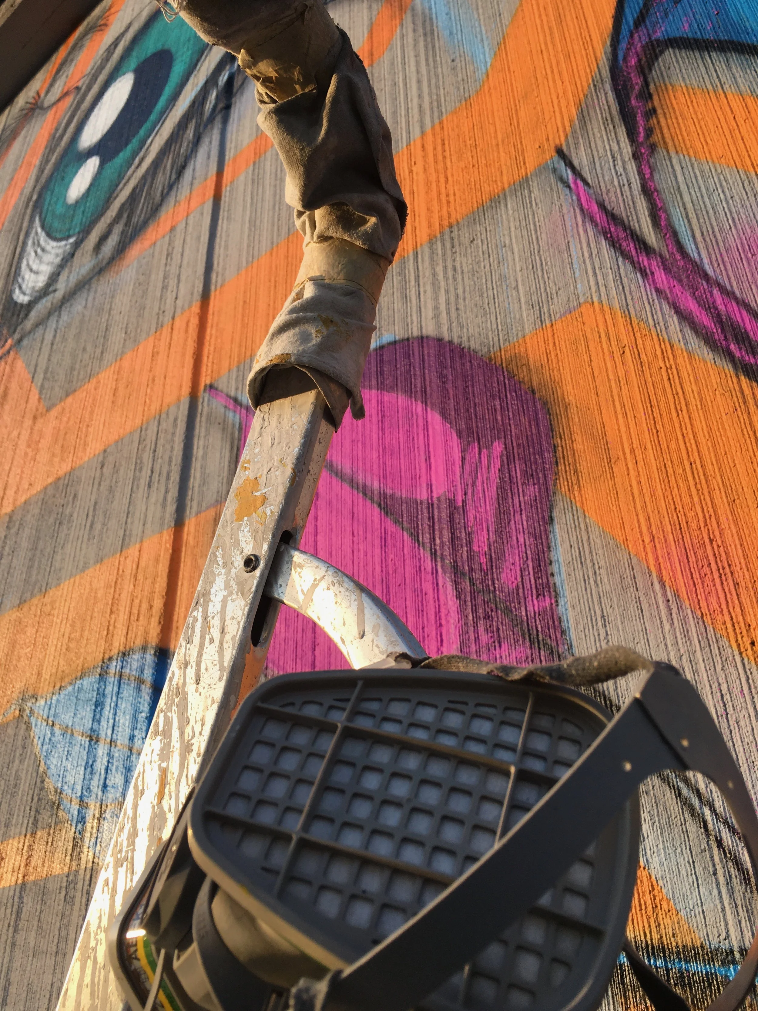 Graffiti colorato su un muro, con parte di una scala e attrezzatura da pittura in primo piano.